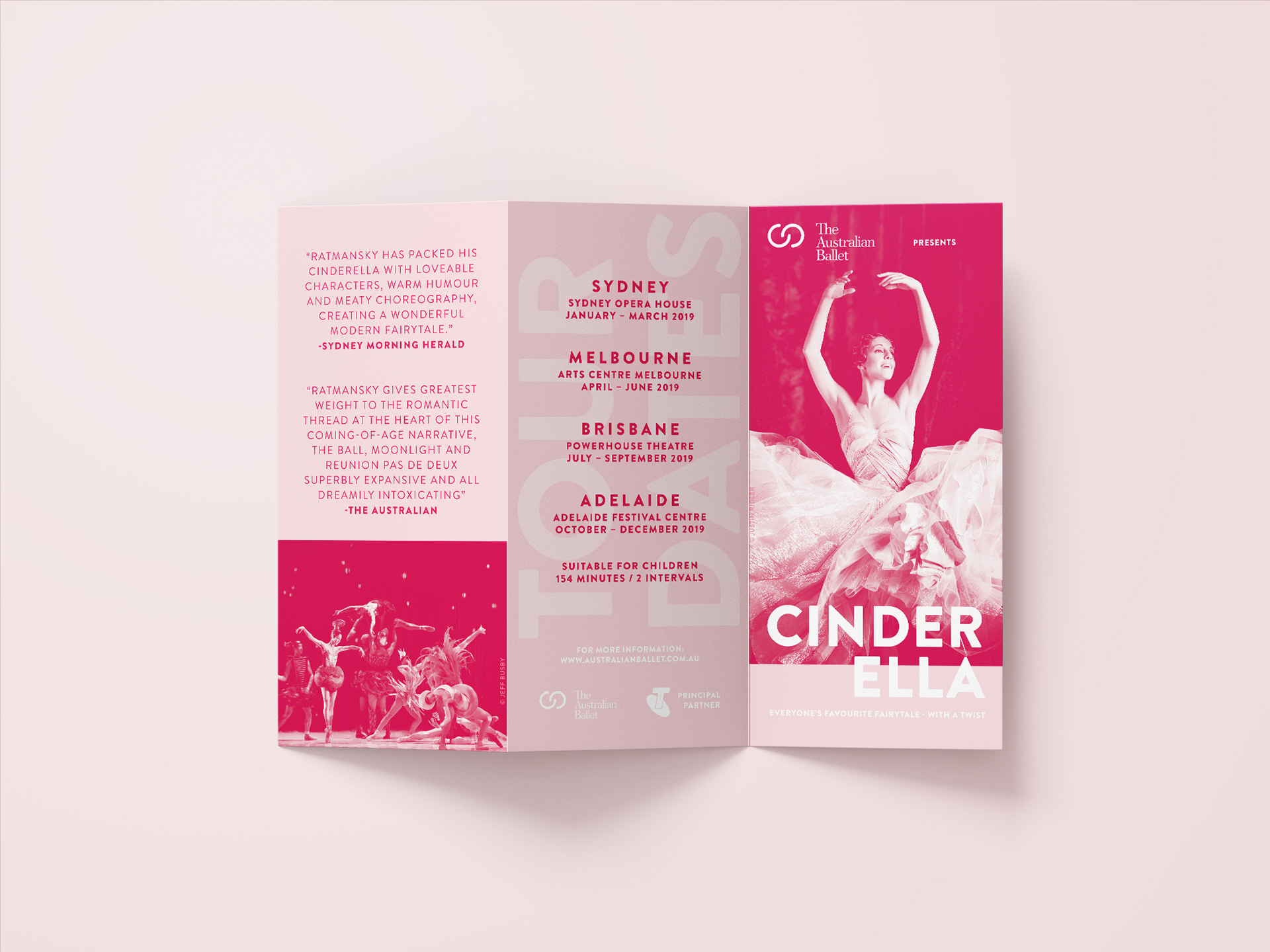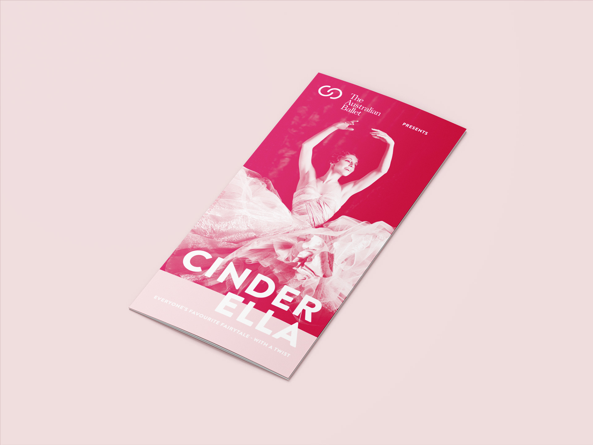 Two-colour DL promotional brochure concept designed for The Australian Ballet’s tour of Cinderella. Modern typography and vivid colour used to reflect the contemporary style of The Australian Ballet and their unique take on the Cinderella story.
